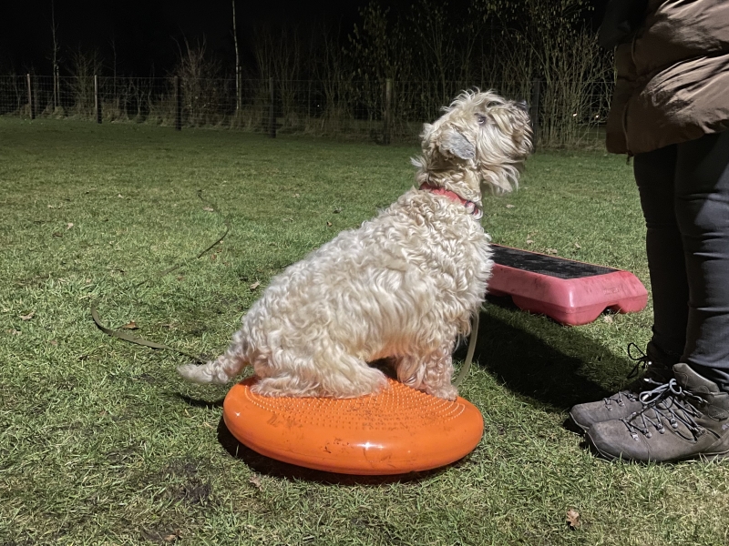 - Pootplaatsing: Begeleid jouw hond hoe hij met zijn voor- en/of achterpoten ergens op moet gaan staan. Eerst lage en stabiele materialen, later instabielere materialen zoals balanskussens.